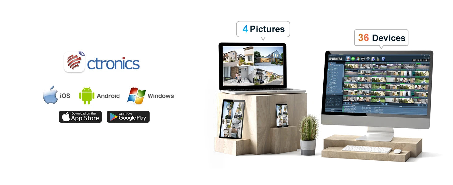 Ctronics security cameras support simultaneous remote access from 4 devices (by APP) or 36 devices (by PC) at the same time, quite suitable for establishing a convenient and safe security system, a high definition CCTV NVR kits, supports NVR that supports ONVIF and 8MP, like as for dahua for hikvision, etc..