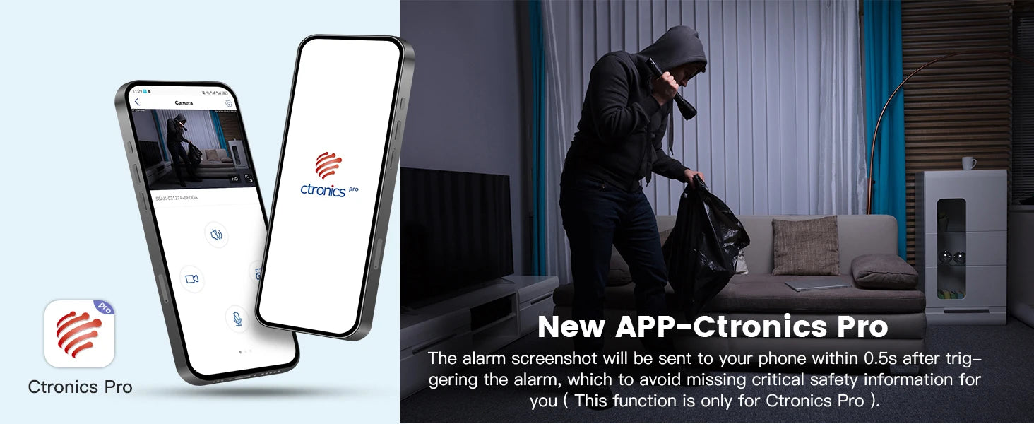 The alarm screenshot will be sent to your phone within 0.5s after triggering the alarm, which to avoid missing critical safety information for you ( This function only for Ctronics Pro APP ).