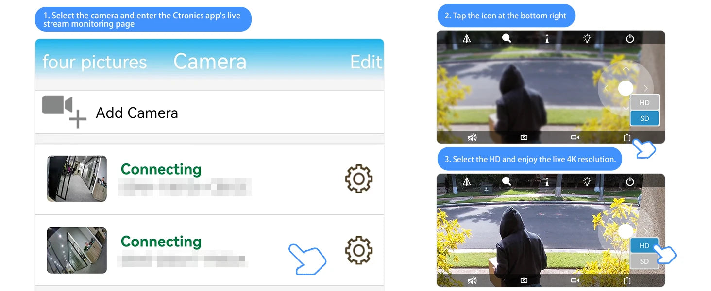 Compared with the wireless WIFI that can only connect to 2.4G, the dual-band wifi transmission technology can support automatic identification and connection of 2.4G and 5G signals, which can well adapt to the needs of wireless networks in different environments. At the same time, the Ctronics 4K 5g wifi camera also has its own AP hotspot, which can be connected to the mobile phone network for real-time monitoring without wifi.