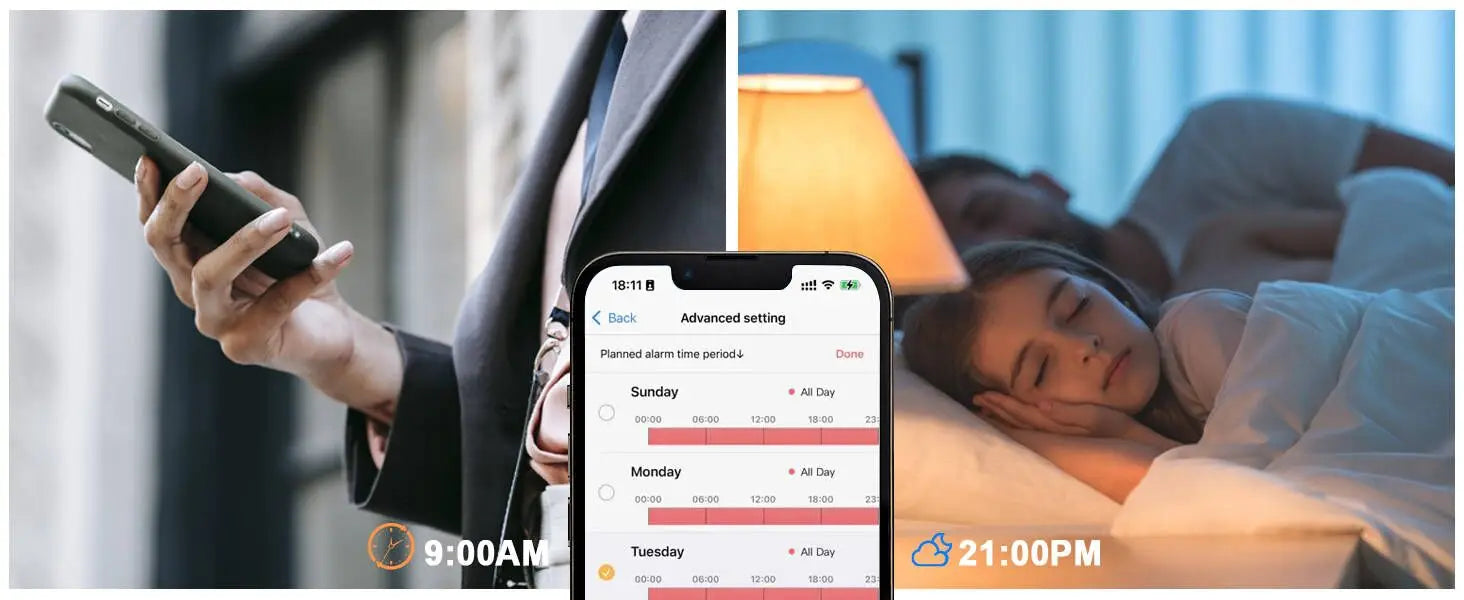 You can set a customized alarm time you want, for example, you don't want to be disturbed when sleeping ; for example, you will go to work so you need the alarm on ; Etc. This feature can further reduce ineffective alarm harassment.
